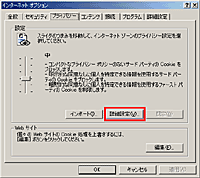 [インターネットオプション]のメニューの中から[プライバシー]タブをクリックすると左の画面が表示されます。 ここで[詳細設定]ボタンを押します。