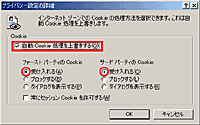 [プライバシー設定]の[詳細画面]が表示されますので[自動Cookie処理を上書きする]という項目にチェックを入れ,有効にしてください。 OKボタンを押して画面を閉じ,インターネットオプション画面も閉じます。これで設定は完了です。