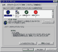 ブラウザのメニューの[ツール]から[インターネットオプション]を選び,[セキュリティ]タブをクリックすると下の画面が表示されます。 ここで一番下にある[レベルのカスタマイズ]ボタンを押します。